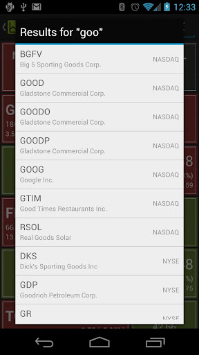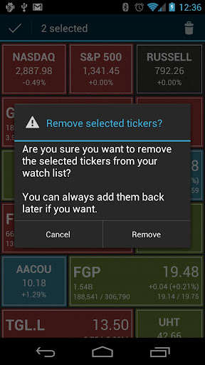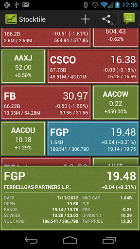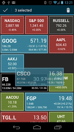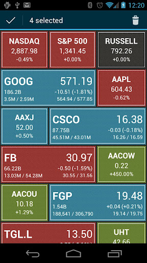 Stocktile was designed to take advantage of the latest features of your Android version. You will feel right at home no matter what version you are running in. There are no new concepts to learn, and no alien features to deal with. Animations are simple and beautiful, and there are just a few things you will have to do: add stock tickers, delete them, or share them with your friends. If your device is running Ice Cream Sandwich or Jelly Bean, you can also reorder your watch list by dragging and dropping tickers around: just long-press a colored tile, and when it gets selected, long-press it again and start moving your tile around.