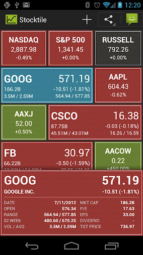 Using colored tiles, now you have a different way to organize the stock tickers that you care about. No more packs of smalls numbers crammed together in your device. No more loads of data that you are not interested in. Stocktile is the simplest stock watcher application on the Google Play Store. Just what you need in front of you. Period.