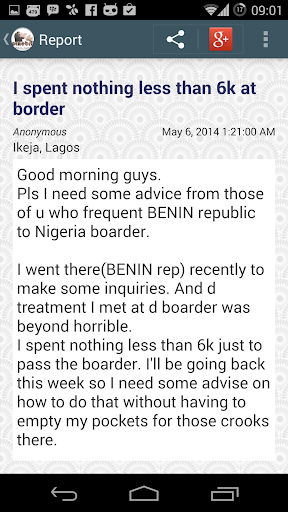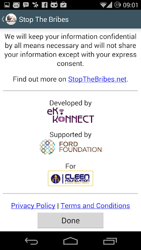 This app is a mobile extension of Cleen Foundation’s online platform for collecting and documenting reports of bribery, extortion and similar offences. The app makes it easier for Nigerian citizens to report instances of bribery and extortion using their android phones.