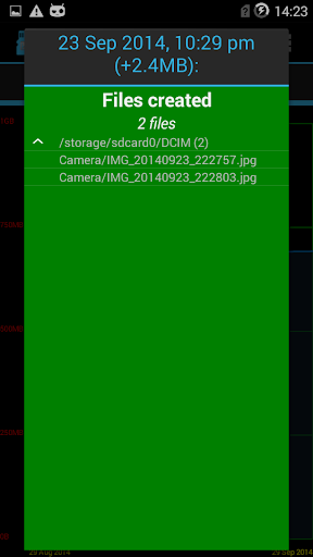 StorageTrac records file activity (creation, modification, deletion) in the external storage of your device. This app collects activity data at regular intervals and plots used storage space over time. Each data point collected can be inspected for the list of file activity in that time window.