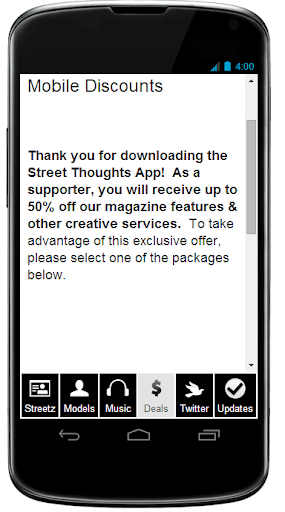 This app will put artists, models & entrepreneurs in direct contact with creative business opportunities. Supporters will receive updates on our community, exclusive music, entertainment, discounts on services & products, free promo material & more! Make sure you follow us on twitter @Street_Thoughts. Also be sure to follow Streetz owner/CEO "TazDatMC" at @TeamTazzy206.