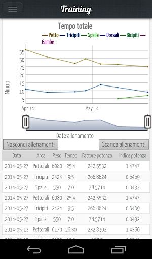 Possibilità di verificare l'andamento tramite l'utilizzo di grafici e di scaricare i dati di allenamento in formato excel.