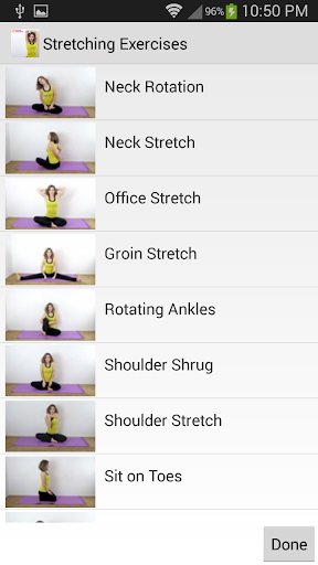 This app has a variety of stretching exercise videos. Whether you are a runner, a computer geek, or just stressed out, this app has something for you. Stretches are grouped in routines: Computer Break, Just woke up, Flexibility, Stress Release, Runners' Cooldown, Back Reliever, and Ankles & Feet Love.