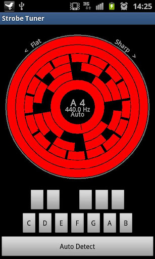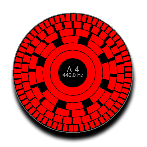 To use the strobe tuner, select the desired note and observe the pattern created when playing. Rotation indicates that the note is sharp (clockwise) or flat (anticlockwise). The faster the rotation, the more out-of-tune. This rotation is very precise and gives a much more accurate result when compared to ordinary electronic tuners. Each ring on the disc corresponds to a partial above the fundamental (the two inner rings are below the fundamental) and can be used to tune instruments with many partials.