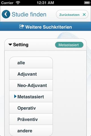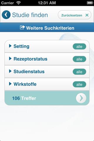 • Umfangreiche Filterfunktionen wie z.B. Studienphase, Studiensetting, Rezeptorstatus, Sponsoren, Fachgesellschaften