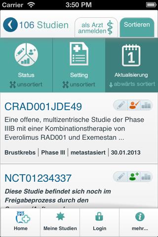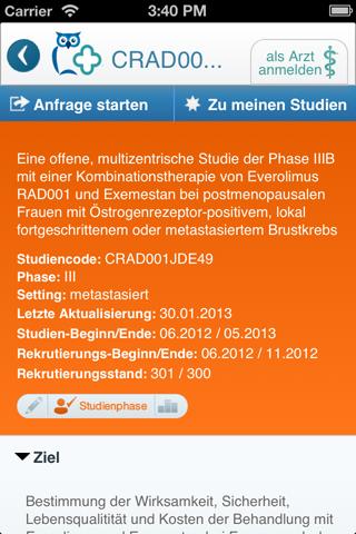 Die Studienfinder-APP bietet eine schnelle, mobile Möglichkeit, sich eine Übersicht über rekrutierende, laufende, geplante und ausgewertete Studien zu verschaffen. Diese kostenfreie APP richtet sich sowohl an Patienten/Betroffene als auch an Ärzte/Fachpersonal und bietet ein einzigartiges Instrument für Ihre persönliche Studiensuche. Verschiedene Filter sowie eine Direktsuche führen zu einer Liste von Studien, elektronischen Kittelkarten (eFacts), Detailinfos zur Studie (Ein-, Ausschlusskriterien, Design, Ziele, Logistik, Studienstatus, Timelines, Abstracts, Links etc.), teilnehmende Zentren und Kontaktadressen.