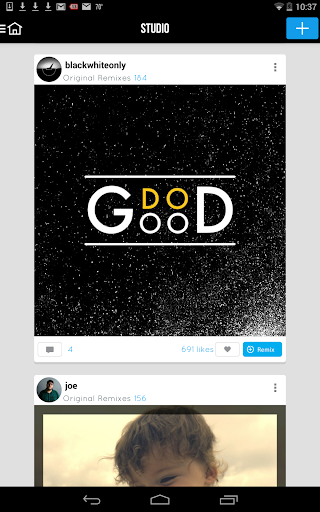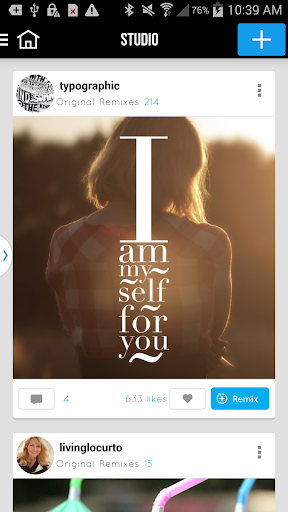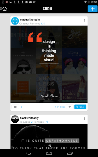 Studio is the first social design platform that lets you browse and remix designs from other users. If you see a design you love just tap the 'remix' button and make it your own. It's never been this easy to design!