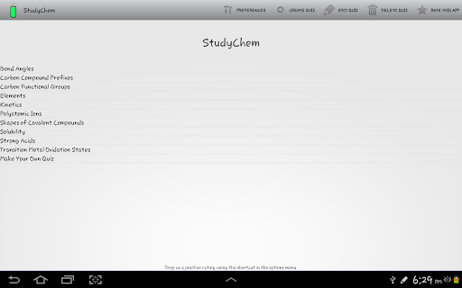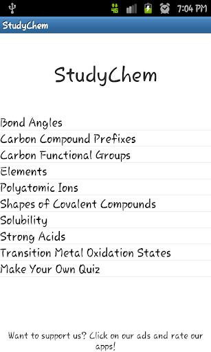 An app designed to help someone study and memorize chemistry-related items. Especially recommended to users studying for the AP Chemistry test. New quiz creator! Create and edit your own quizzes.