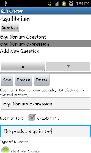 Basically a compilation of sets of flashcards, this app asks you questions (such as "What is the chemical symbol for carbon?" for a simple example) and tells you whether your answer is right or wrong. Built-in quiz topics include chemical symbols, solubility, polyatomic ions, charges of transition metal ions, and shapes of covalent compounds. Be sure to try out the new quiz editor!