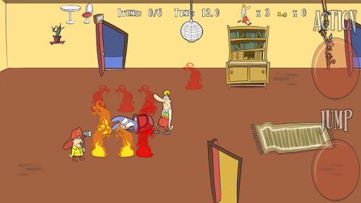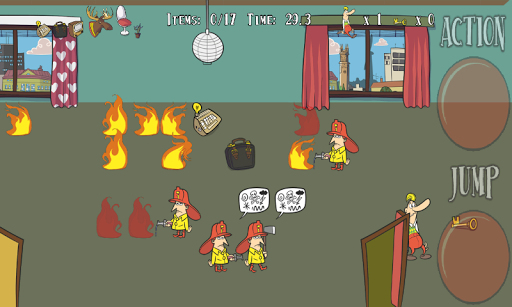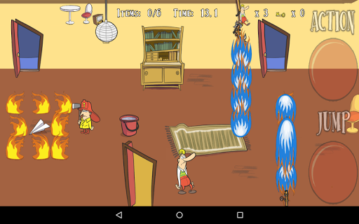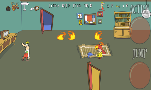 The game features 20 levels of increasing difficulty. The player has to save items of personal value from the flames and navigate through a maze of rooms, all the while avoiding firefighters that are out to save your skin (but not your stuff!)