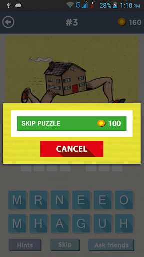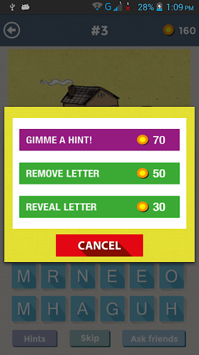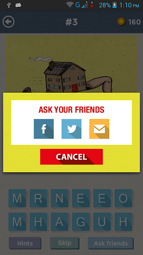 Stuck? you can buy hints, reveal and remove letters. You can also ask your friends on facebook, twitter or email for help.