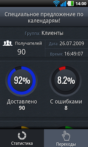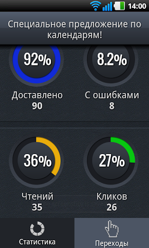 • Просмотр статистики последней рассылки: количество получателей, показатели доставки, ошибок, чтений, переходов по ссылкам.