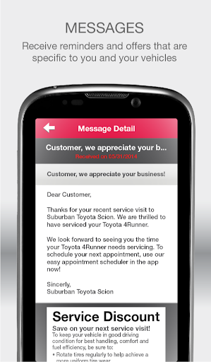 Make your vehicle ownership experience easy with the free SUBURBAN CONNECT mobile app. This feature-rich app allows you to get the most out of your vehicle by helping you to maintain and organize essential car details like service history, as well as save money with mobile offers and coupons!