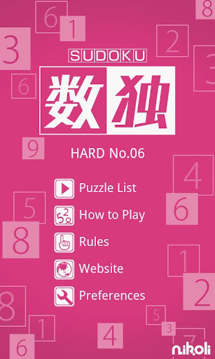 "Sudoku by Nikoli Hard 06" contains 16 hard Sudoku puzzles. We have released other Android application packages with easy or medium hard puzzles. We hope you will enjoy those too.