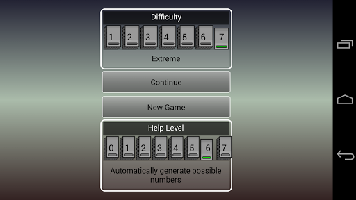 - select one of 8 levels of help (from "Without help" through "Automatically generate possible numbers" to "Automatically solve easy steps"