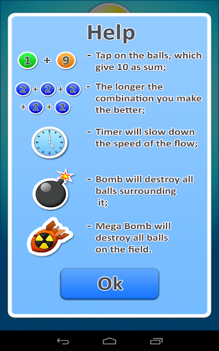 You have to get sum of points equal to 10 by tapping on the various balls. The bigger the combination of balls the more extra points you get. There are different bonuses that will help you to succeed in getting the highest score. There are two game modes for relax and challenging gaming. Try to break the high score record. Good luck!