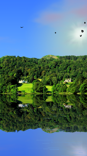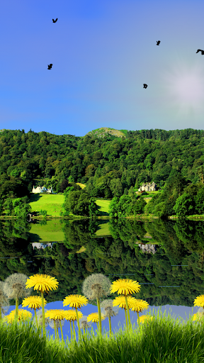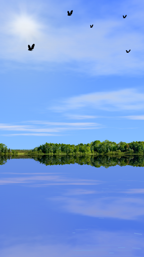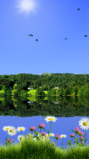 A clean and nice summer background reflecting in the calm relaxing waves of the lake. Flowers and grass in the foreground, birds in the air and a live sky with clouds, sun and moon depending on the time. Horizontal scrolling support on all devices.