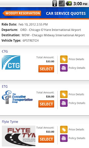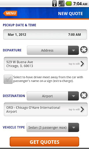 Use your phone's GPS to select your current location, select from a list of airports, or simply enter in an address from your departure and destination locations. Compare the list of quotes, select your preferred car provider and book a reservation in real-time!