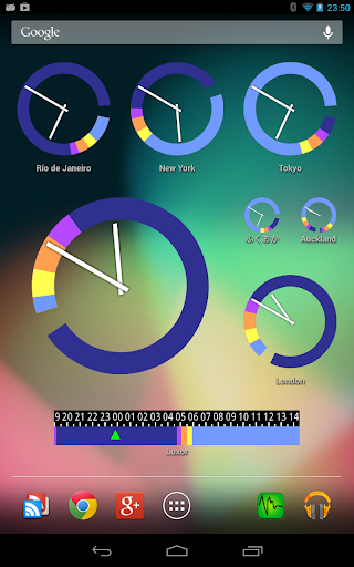 SunClock is a sweet, resizable clock widget for your home screen. Not only is it a beautiful analog clock, its colored segments show the periods of low sun around sunrise and sunset, including `golden hour', and the periods where the sun is under the horizon but its light is visible (`blue hour'). Essential information for photographers and for any outdoor activity from hiking to sailing, and it is now available in a handy widget right on your home screen.