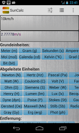 A unique feature of this App is the integrated possibility to convert between expressions given with different units. It does not only support the simple conversion like Inch to Meter "in ⇛ m" from one unit to the other like many other unit conversion Apps. It also supports the conversion of complex units like Inch per hour into Meter per Second "in/h ⇛ m/s".