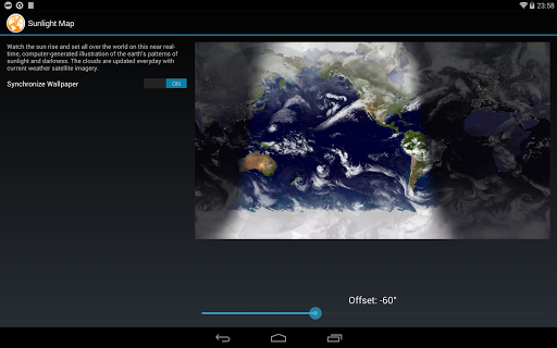Sunlight Map updates your wallpaper with a computer-generated illustration of the earth’s patterns of sunlight and darkness. The clouds are updated everyday with current weather satellite imagery.