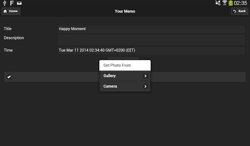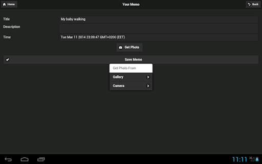 This application allows you to save your audible memos (such as talks, lectures, reminders, business meeting, kids voice, …etc) and also your visual memos (such as photos) using an easy-to-use and responsive user interface. It allows you to also manage all your memos from a single unified listing.