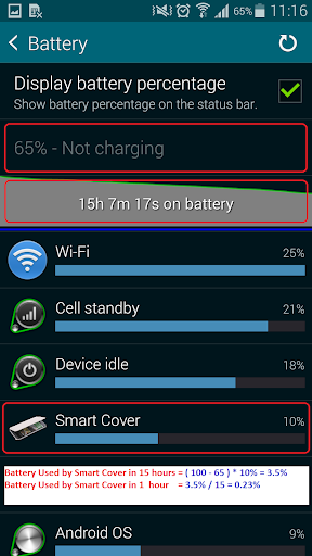 In live test with Samsung Galaxy S5 , Smart Cover consumed just 3.5% battery for more than 15 hour usage.