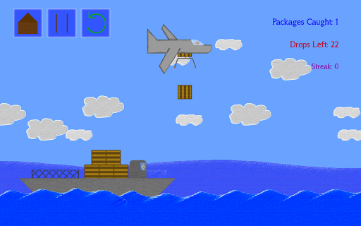 The goal of Supply Drop is to drop packages onto passing ships. Touch anywhere on the screen to drop a package, it will reload a short time after on its own.