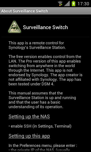 Enable and disable Synology's Surveillance Station right from your android device ! Surveillance can be switched on and off with a simple tap on your screen.