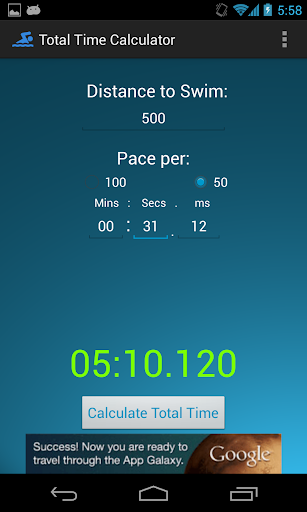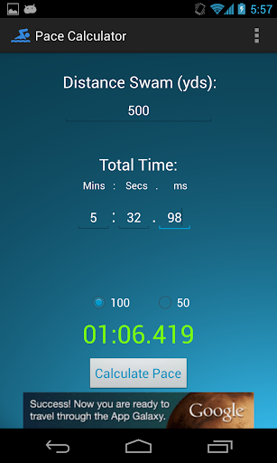 Simple application to calculate your pace over a given distance. Just finished a race and want to know what your average split was per 50? Simply enter your race distance and total time and the app will do the rest for you!