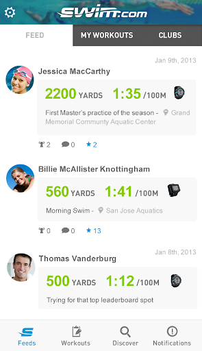 Swim.com allows swimmers to track their workouts with a compatible wearable device. Train with your Swim.com compatible smartwatch, Pebble, Garmin, Finis or Poolmate device and upload your workouts to the Swim.com platform. With the Swim.com app for Android, you can track your progress over time in a variety of metrics such as Distance, Speed and Efficiency, helping you bring your training to a whole new level. Connect with other Swimmers, find Pools, join Clubs and compete on Leaderboards.