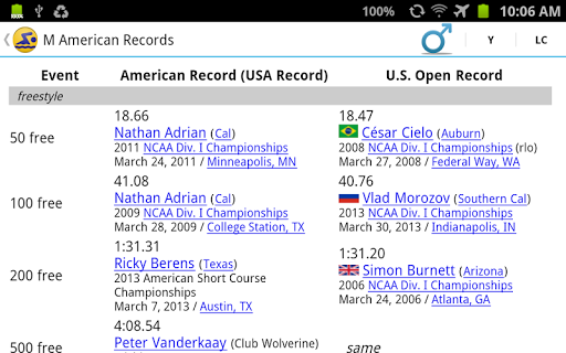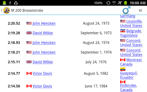 Quick and easy reference to various elite swimming history, current records, and rankings for the major international championship zones. The app strives to be 100% current, and thus taps into various Internet data sites, as opposed to storing dated information on your device. (As such, I expect links to break from time to time - if so, please let me know and I'll try to update as soon as possible.)