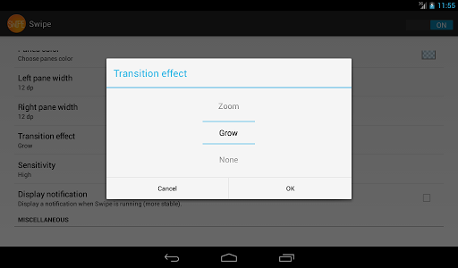 - Choose the transition effect between two apps (slide, fade, pivot, zoom, grow...) on version of Android older than 4.1 (API 16).