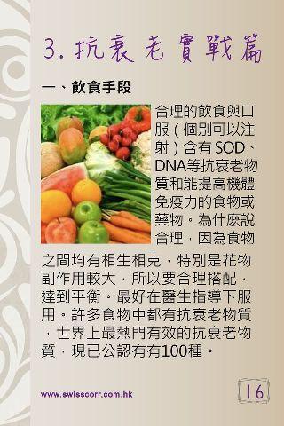 本書主要介紹蘋果幹細胞的由來, 幹細胞究竟是何物? 它具有什麼神奇功能呢? 為何使用含有幹細胞科技的產品時能發揮神奇的抗老功效? Dr Fred Zulli 研發的瑞士蘋果幹細胞更獲得了《2008年歐洲化妝品保養品發明大獎》。本書亦介紹蘋果幹細胞除皺效果及如何防止紫外線對皮膚造成破壞。 另外還有其他抗衰老成份如大豆異黃酮, 維生素C, 膠原蛋白, 穀胱甘肽, 玻尿酸, 鮭魚 - 蝦青素的介紹。
