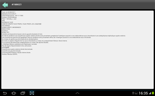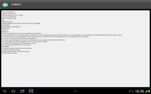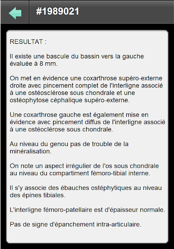 Cette application permet de consulter ses résultats d'imagerie (images et compte rendu) en mettant en oeuvre une connexion sécurisée avec un serveur SYNAPSE Wave hébergé au sein la structure radiologique équipée, ayant réalisé l'examen radiologique.