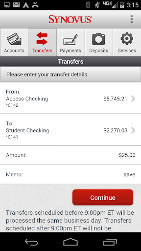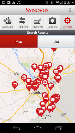 Use Synovus Mobile Banking to deposit checks by taking a picture, view balances without signing in, send or receive payments from friends and family, pay bills, transfer money between your accounts with us, and find Synovus branches and ATM locations.
