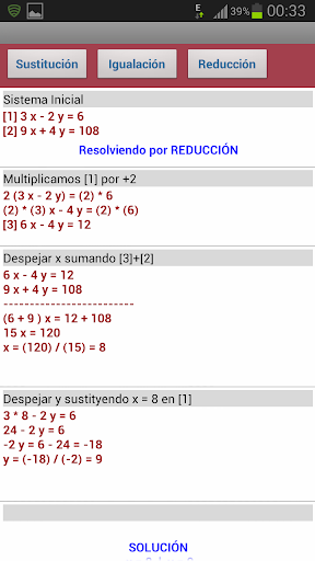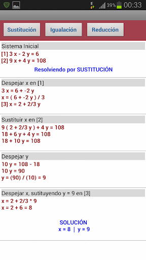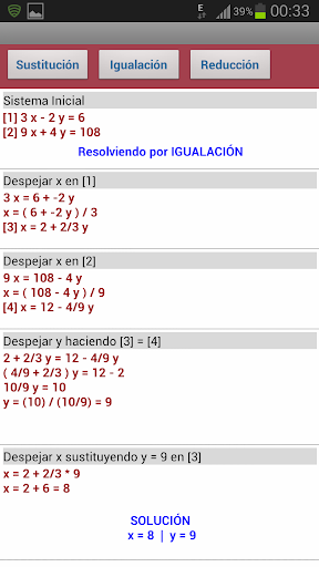 Una vez introducidos correctamente los coeficientes del sistema podemos ver su resolución por los métodos de sustitución, igualación y reducción. Todo esto paso a paso como si se hiciera en una libreta.