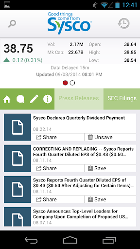This app gives Sysco Corporation (NYSE: SYY) investors mobile access to the latest stock data, news, SEC Filings from Sysco Corporation, as well as proprietary company content including presentations, conference calls, videos, sales and marketing collateral, fact sheets, annual reports and other qualitative company information. Investors are able to receive push notifications when new content is added to theIRapp; add events to their calendars, share content as well as download it for offline viewing.