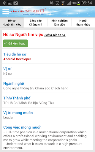 Ứng dụng Tìm Việc Nhanh bản dành cho Người tìm việc: cập nhật, tạo hồ sơ người tìm việc tại http://www.timviecnhanh.com ngay lập tức, bất cứ lúc nào, bất cứ nơi đâu, trên bất kỳ thiết bị nào sử dụng HĐH Android (điện thoại thông minh, máy tính bảng, máy tính, thiết bị đọc..)