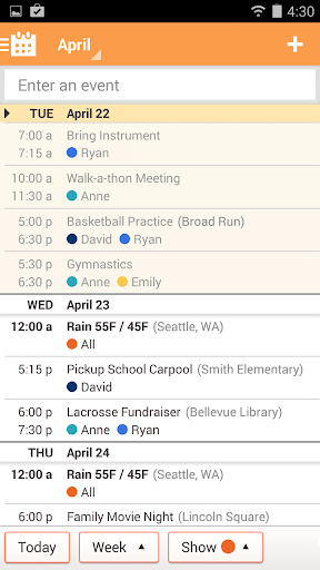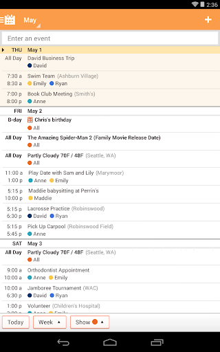 • Color-coded by individual - filter to see a family member's calendar or the whole family at once.