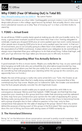 TC Offline allows you to read Thought Catalog in a mobile-friendly format, archiving recent articles for offline access. Whether you're underground on the subway or in the air on a flight, you'll always be able to catch up on Thought Catalog.