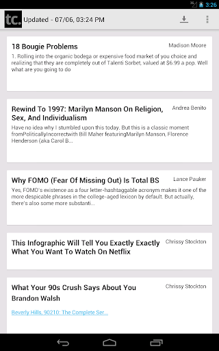 The 25 most recent articles posted to Thought Catalog are available through the app, and will refresh on-demand or every 24 hours.