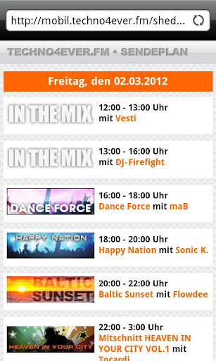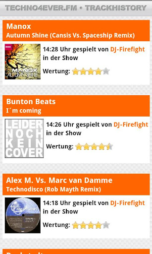 Using the TECHNO4EVER Android-App it is no longer a secret which track is playing right now. Anytime you can have a look at the track list and you will even figure out which tracks were played within the last four hours.