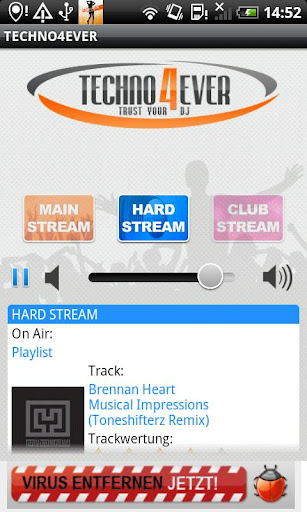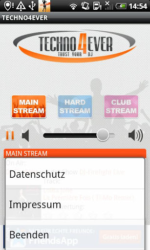 The TECHNO4EVER Android-App combines every important service of the internet radio TECHNO4EVER. True to the slogan “Trust your DJ” TECHNO4EVER offers day in and day out clubsounds out of the national and international dance charts. The TECHNO4EVER Android-App provides you with a mix of HandsUp, House, Electro, Hardstyle, Jumpstyle and Trance onto your Smartphone including the well-known visual appearance of TECHNO4EVER.