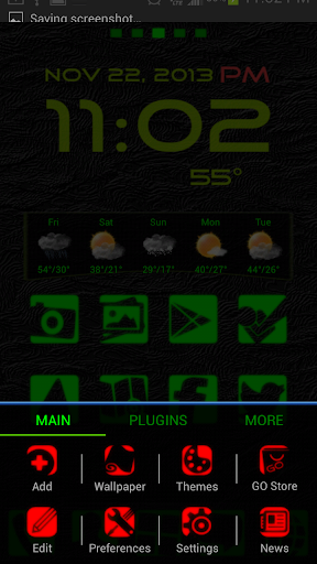 This theme for GO Launcher EX transforms your android phone into a cool, modern looking gadget featuring glowing green modern-looking icons peeking through a black leather background. In the screenshots, the app labels are hidden just because it looks more cutting-edge without them. This theme will cover most if not all of your common icons, but it also comes with dozens of extra icons you can apply individually.