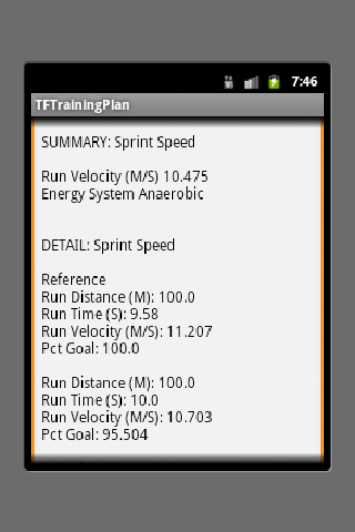 Application also provides Evaluation of Training results after training data is entered into Training Session(s). Evaluation of Jump Distance, Throw Distance, Speed, Endurance, Strength, or Power provides results, both individual detail and an overall summary. Evaluation of Training results provides event performance analysis and estimates of athlete fitness level.