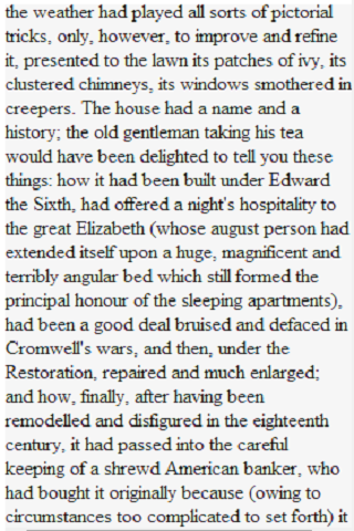 Under certain circumstances there are few hours in life more agreeable than the hour dedicated to the ceremony known as afternoon tea. There are circumstances in which, whether you partake of the tea or not—some people of course never do,—the situation is in itself delightful. Those that I have in mind in beginning to unfold this simple history offered an admirable setting to an innocent pastime. The implements of the little feast had been disposed upon the lawn of an old English country-house, in what I should call the perfect middle of a splendid summer afternoon. Part of the afternoon had waned, but much of it was left, and what was left was of the finest and rarest quality. Real dusk would not arrive for many hours; but the flood of summer light had begun to ebb, the air had grown mellow, the shadows were long upon the smooth, dense turf. They lengthened slowly, however, and the scene expressed that sense of leisure still to come which is perhaps the chief source of one's enjoyment of such a scene at such an hour. From five o'clock to eight is on certain occasions a little eternity; but on such an occasion as this the interval could be only an eternity of pleasure. The persons concerned in it were taking their pleasure quietly, and they were not of the sex which is supposed to furnish the regular votaries of the ceremony I have mentioned. The shadows on the perfect lawn were straight and angular; they were the shadows of an old man sitting in a deep wicker-chair near the low table on which the tea had been served, and of two younger men strolling to and fro, in desultory talk, in front of him. The old man had his cup in his hand; it was an unusually large cup, of a different pattern from the rest of the set and painted in brilliant colours. He disposed of its contents with much circumspection, holding it for a long time close to his chin, with his face turned to the house. His companions had either finished their tea or were indifferent to their privilege; they smoked cigarettes as they continued to stroll. One of them, from time to time, as he passed, looked with a certain attention at the elder man, who, unconscious of observation, rested his eyes upon the rich red front of his dwelling. The house that rose beyond the lawn was a structure to repay such consideration and was the most characteristic object in the peculiarly English picture I have attempted to sketch.