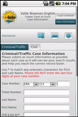 1. Search case information within the Toledo Municipal Court system for both civil and criminal/traffic divisions. Results include full journal entries, status of case, suit amounts, plaintiff/defendant information, attorney information, links to scanned documents, links to priors, and the ability to make payments on payable items.