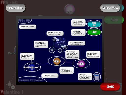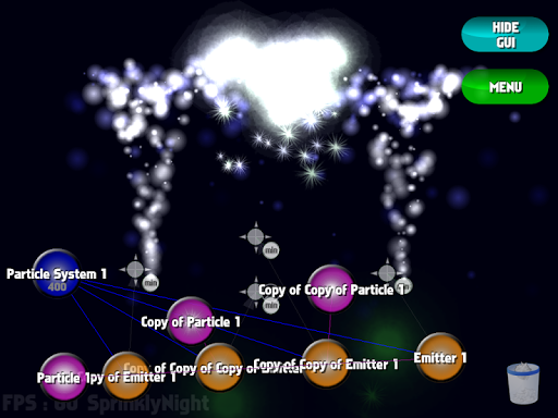 The default project contains 1 Particle System, 1 Emitter and 1 Particle. Tap and hold to move them around. Single tap to open the object menu. Use the menus for detailed options. Use the Main Menu to add more objects.