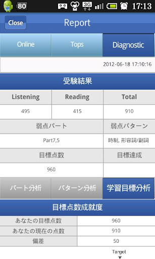 「学習内容」の欄で後述するように、模擬テストで正確な実力分析をした上で、ユーザーひとりひとりに最適な弱点克服学習を提供します。ですから、200点台から900点台まで、どんなレベルの人にも学習効果を発揮するアプリです。